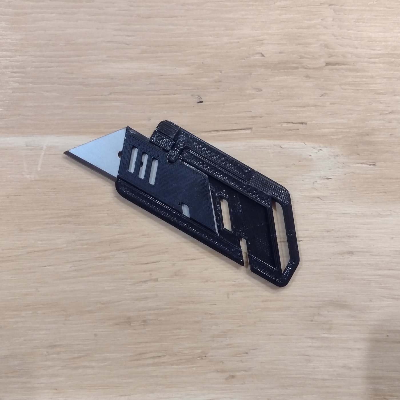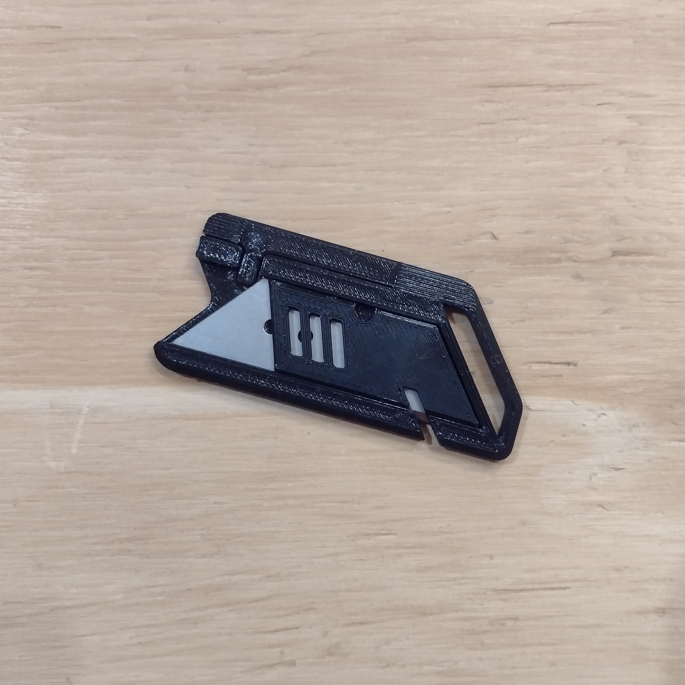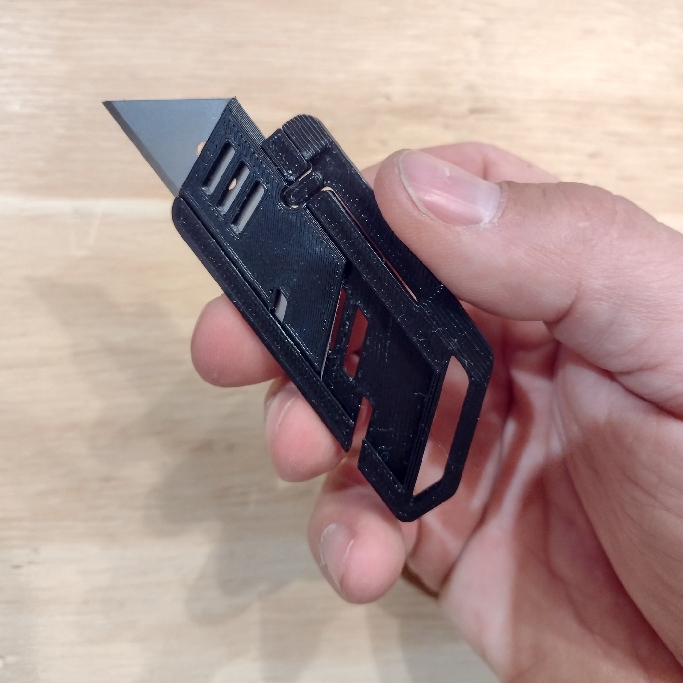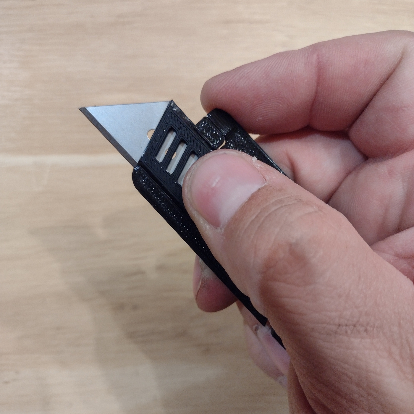 Cuando el fijo se encuentra guardado el diseño de la pieza permite tener acceso al filo en su parte posterior para cortar hojas o hilos sin peligro de cortarse.